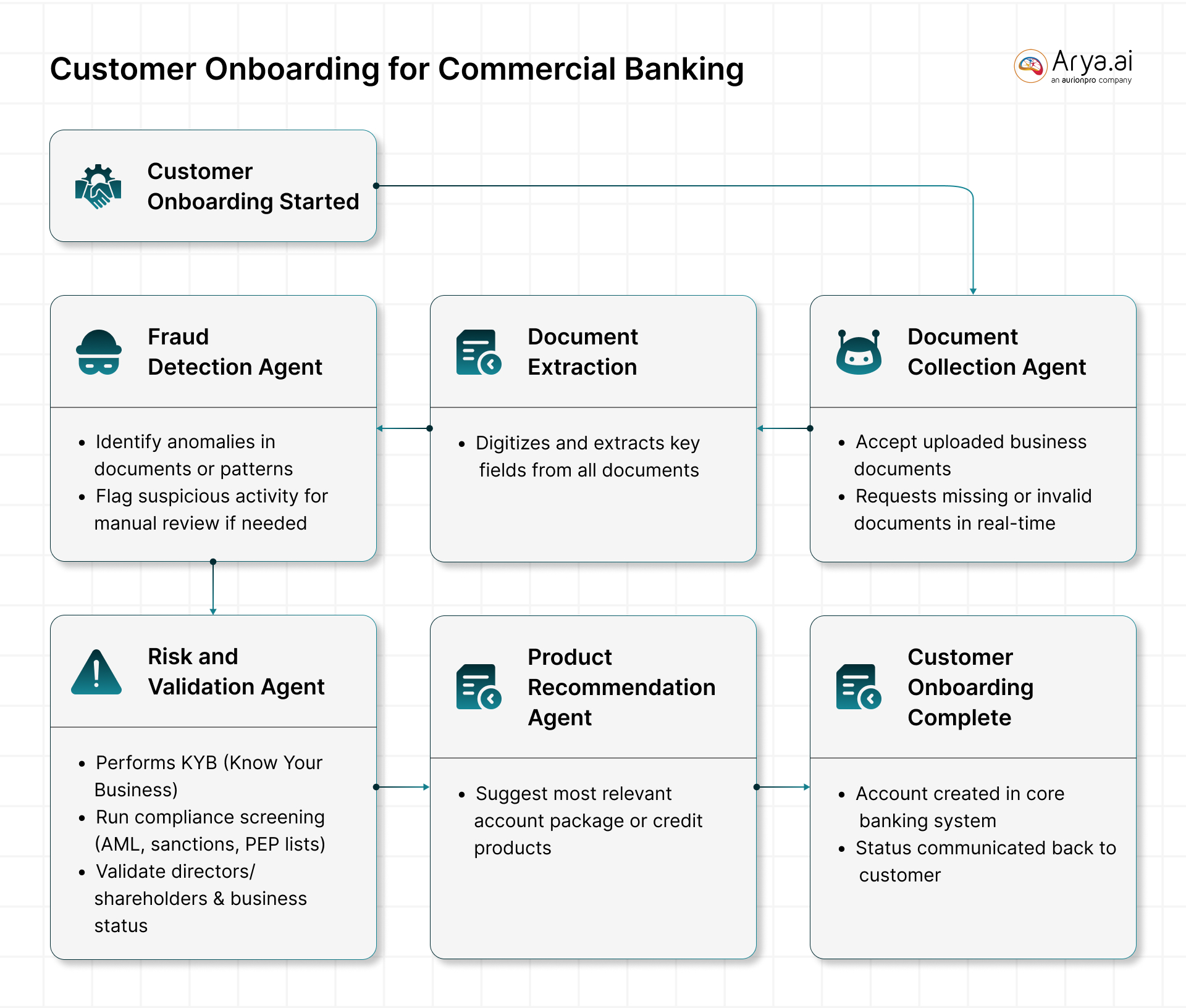 Bringing a business client on board is notoriously complex — multiple documents, shareholder information, KYB checks, and credit evaluations are needed before an account is approved. Agentic onboarding solves this by orchestrating multiple agents that work together: one pulls company registration data, another analyzes financial statements or cash flow, and yet another screens directors and stakeholders. Because these steps run simultaneously, what used to take weeks of back-and-forth can now be completed in minutes. Relationship managers can then spend time building trust and advising clients instead of chasing paperwork, which strengthens the bank’s relationship with new business customers from day one.