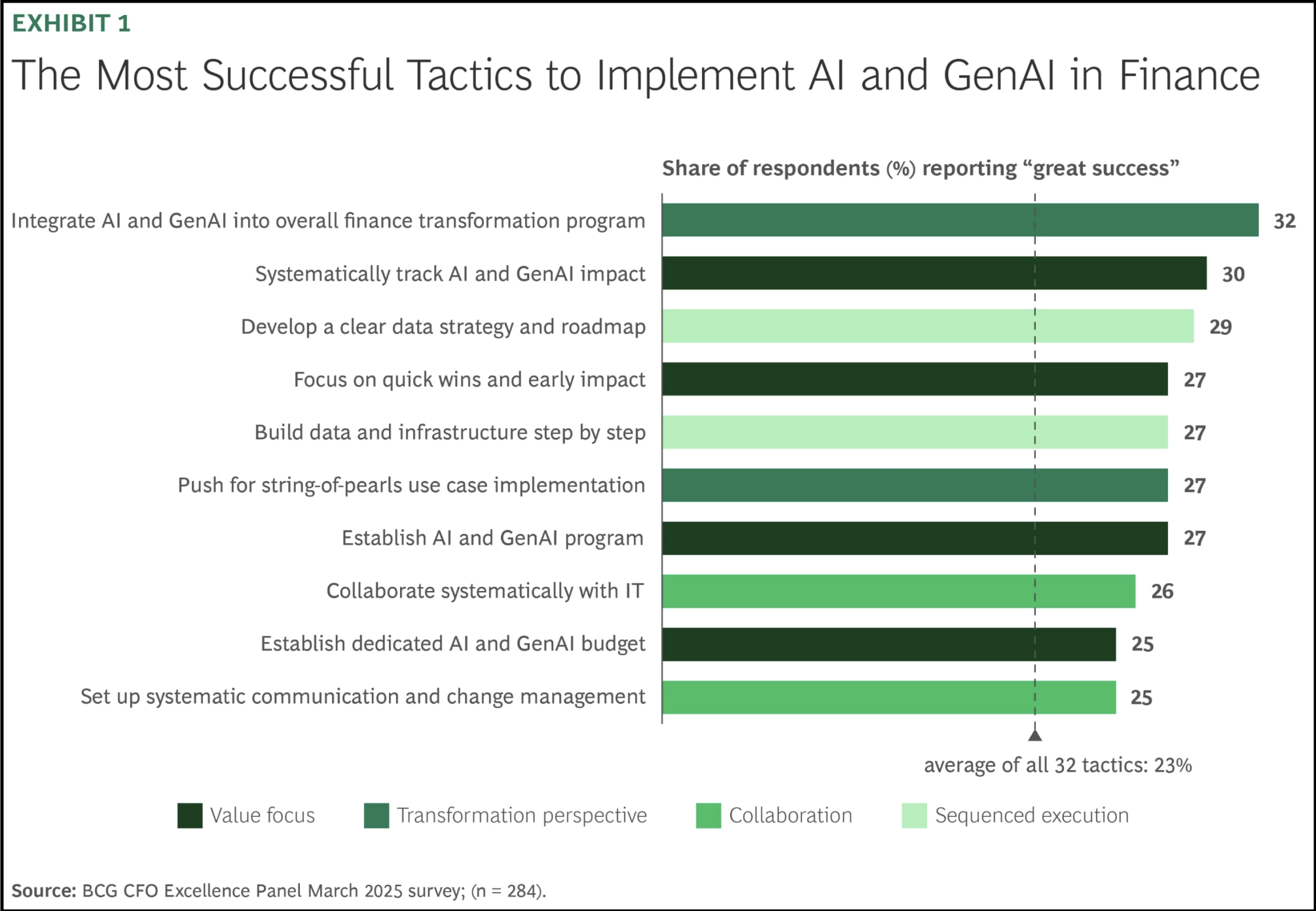 According to a BCG survey, the most successful finance AI initiatives share common tactics (see chart above). CFOs should craft their AI adoption playbook with these principles in mind: